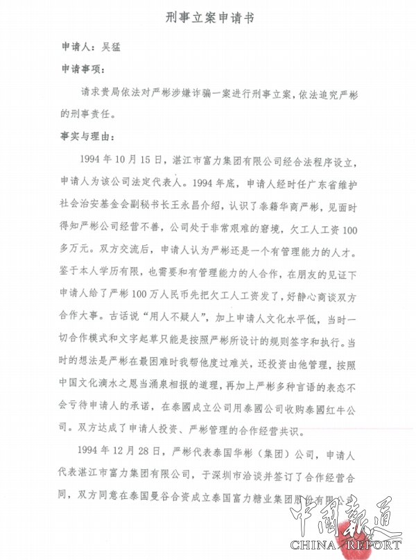 中国报道讯(吴蜀丰报道)据多家媒体报道,华彬集团霸占红牛败诉的消息后,红牛的真正的主人吴猛终于发声了,华彬集团有今天早已预料中的事,吴猛出示了1994年12月28日通过招商银行汇款八千万元的汇款凭证及向司法机关提交的刑事申请书,吴猛在 1993 年花费 100 万美元从泰籍人许书标手中购得红牛配方和整个公司,在 1994 年与严彬合作投资建厂销售红牛。然而,2022 年 5 月之前红牛公司经历了数起官司,且严彬多年来从未与吴猛分享分红,也没有任何解释。为此,吴猛在 2021 年 10 月寻找吴利凡培养其作为接班人,并在同月 25 日与任秀春和张学东作证的情况下,在湛江签署了一份授权委托书,明确吴利凡为红牛配方的法定 继承人。吴猛亲自传授了配方的几个关键点,并在 6 个月后品尝确认吴利凡制作的红牛产品符合标准。为了感恩吴猛的信任和培养,吴利凡将该产品命名为“吴猛红牛”。
