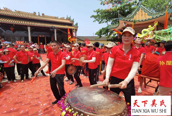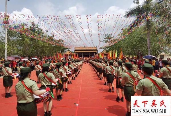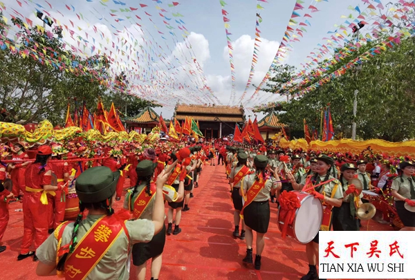 上午九点,被邀请庆典活动的26个纯吴姓村庄的代表仗人丈队,各式的彩车精制形象,猛龙舞动,瑞狮跳桩,威风锣鼓,彩旗飘飘,地方调声婀娜多姿,共有约2万多人参加拜谱典礼。庆贺仪式精彩纷呈,随着敲锣打鼓,声声悅耳,使人心情进奋。