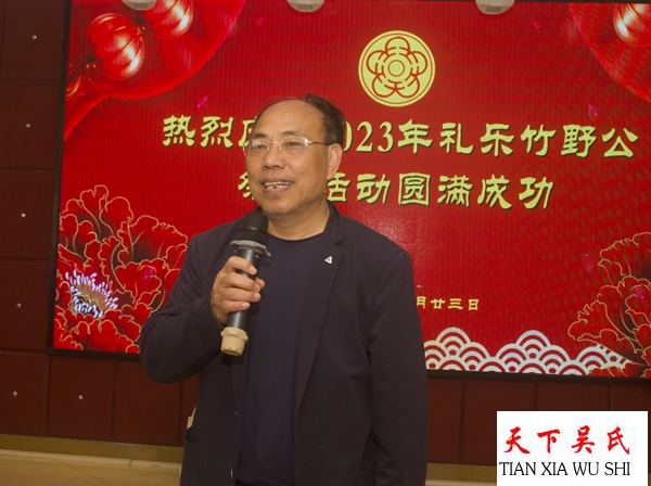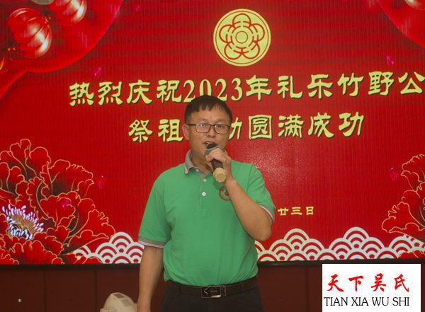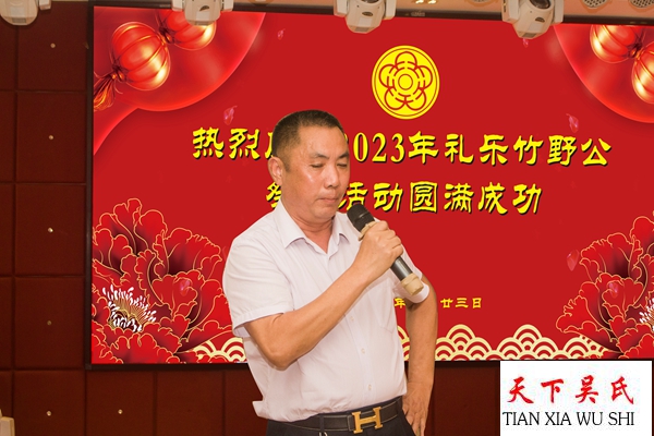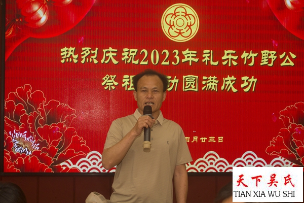 泰伯基金会、珠三角宗亲会秘书长吴昌禄代表泰伯基金会致词说,祝礼乐吴竹野公联谊会祭祖圆满成功,要弘扬至德精神,凝聚宗亲,同心协力发扬光大吴氏家族的传统美德。祝大家身体健康,家庭幸福。南雄珠玑巷泰伯后裔联谊会吴峰会长致词祝2023年礼乐吴氏竹野公祭祖活动圆满成功。传承吴文化,至德精神永流芳,为中华民族的伟大复兴和进步做出更大贡献。祝大家身体健康,万事如意。