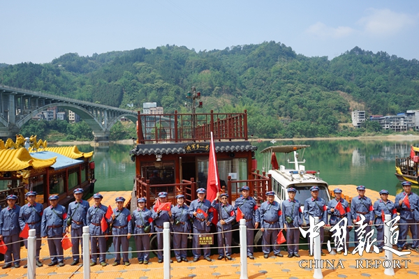 中国报道讯 (通讯员 岑福山 覃 源 韦启阳)5月6日上午,伟人邓小平在广西东兰领导革命曾五渡红水河的安篓红军渡遗址斜对面,广西东兰县隘洞御码头,红色高大的《将军乡一号》和《第一湾一号》游船上,军旗飘扬,军歌嘹亮,统一着红军服装的广西第一湾国际旅游股份有限公司部分员工,随着国旗的升起,他们在这里举行隆重的坐红船寻伟人足迹旅游线路启动仪式。