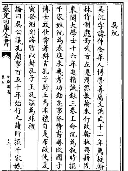 吴沉(?-1386) [3]  ,字浚仲,浙江承宣布政使司金华府兰溪县(今浙江省金华市兰溪市)人。元国子博士 吴师道子也,以学行闻。太祖下婺州,召沉及众多会食省中,日令二人进讲经史。已,命沉为郡学训导。沉尝著辩,言“孔子封王为非礼”。后布政使夏寅、祭酒丘濬皆沿其说。至嘉靖九年,更定祀典,改称“至圣先师”,实自沉发之也。