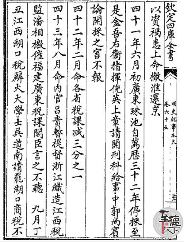 织造中官刘成死,遣其党吕贵往护,贵嗾奸民留己督造。中旨许之,命草敕。道南偕从哲争,且询疏所从进,请永杜内降,弗听。鄱阳故无商税,中官为税使,置关湖口征课。道南极言傍湖舟无所泊,多覆没,请罢关勿征,亦不纳。