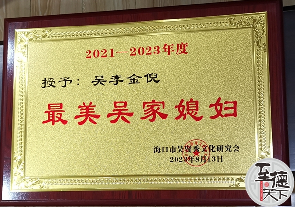 至德天下网讯(吴蜀丰)8月13日,海口市吴贤秀文化研究会会员表彰大会暨高考优秀学子奖助学金颁发仪式上,她被评为吴家“最美媳妇”。