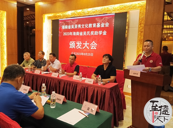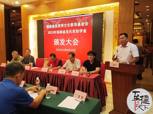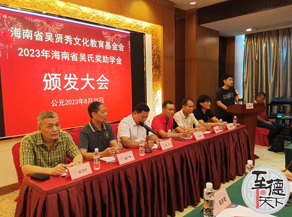 至德天下网(吴开河海南报道)8月25日下午,海南省吴贤秀文化教育基金会在海口市明光胜意酒店会议厅举办2023年海南吴氏奖助学金颁发大会,为品学兼优的学生给予支持与鼓励,同时为特困家庭的学生给予扶持帮助,真正体现吴氏人支持文教、敦宗睦族、互帮互助的人文关怀。奖助学金发放对象包括今年本省参加高考分数在750分以上并被录取的全省吴姓学子经报名审核后确定其奖励者,对家庭困难且有低保证明者,报名审核后确定其助学者。