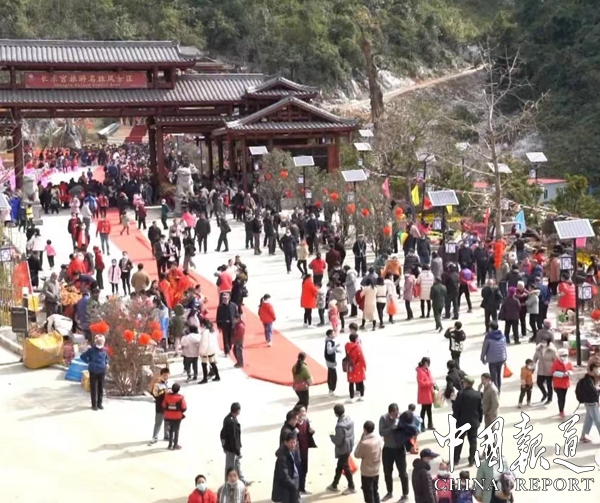 在国家4A级景区长乐宫,游客在工作人员引导下,有序排队进入景区。景区内,游客沿着铺有红地毯的步道,在集喀斯特地貌峰丛洼地、峰林平原、孤峰与石林、天坑、天窗等山景于一身的世界罕见的溶洞,洞内沉积物流石坝、钟乳石、石笋、石瀑布,还有均匀分布的莲花盆、石幕、石旗、石花等上忆年的自然景观。