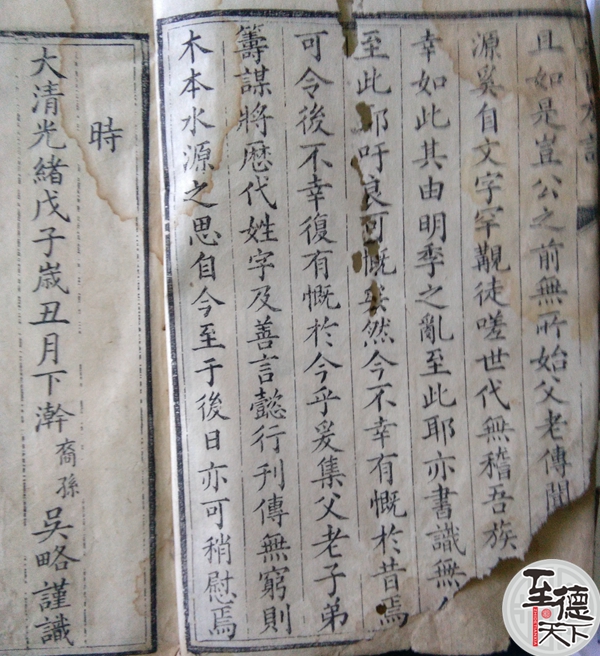 慨夫天道无常,人事多变,自古迄今雖帝胄王家名门右族数世后有叹先泽云止甚有不知先绪由来者,至于寒贱之家不侍言矣,豈非大可伤悼之事,歟如我吴氏祖籍本属人居丰邑东乡,始于明季春初公,公以不知所始夫木物也独有本水物也尚且如是宣公之前无所始,父老传闻。源吴自文字罕观徒嗟世代无稽吾族,幸如此其由明季之乱至此耶,亦書識無族至此耶吁良可慨矣,然今不幸有慨于昔焉,可今後不幸復有慨於今乎爰集父老子弟,筹谋将历代性字及善言懿行刊侍無窮則,木本水源之思自今至于後日亦可稍慰焉