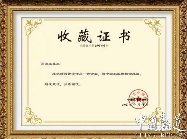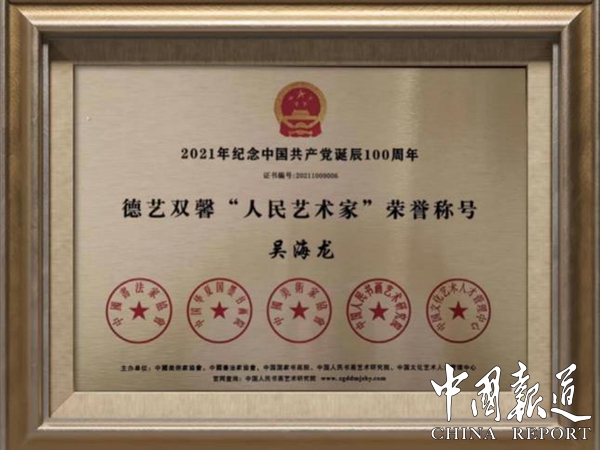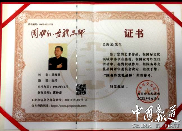 2023年4月,吴海龙在国家素质教育行业中展现了极强的专业性,被北京美育中培职业鉴定中心邀请担任“素质教育导师”,协助素质教育有序地开展,推动素质教育工作的落地和实施;吴海龙先生曾将自己精心制作的“天下为公”紫砂扁鼓壶捐赠给江苏钟山宾馆集团有限公司,体现了他无私奉献的大爱;2023年9月荣获了“国务礼交礼品师”称号;2019 年 6 月,荣获了中国紫砂“薪火相传”国家工艺美术大师特殊贡献奖;2018 年 7月 20 日,其作品《彩蝶壶》荣获了中国工合“一带一路”艺术文化节暨手工艺大师精品展“工合杯”金奖等等......这一系列伟大的成就无不展现出了吴海龙大师高尚的匠人精神。既有对陶艺精益求精的严于律己精神,又有精心学艺的勤奋进取精神,这一系列高风亮节的精神无不激励着一批又一批的年轻人更加矢志不渝地不懈奋斗,源源不断地投入到国家和民族伟大复兴的事业中来。