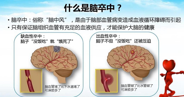 什么是中风?中风也称卒中,是一种急性脑血管疾病,是由于脑部血管突然破裂,或因血管阻塞导致血液不能流入大脑,而引起脑组织损伤的疾病。没有血液和氧气供应,缺血部分的脑组织就会出现坏死。坏死脑组织支配的躯体部分就会出现功能异常。