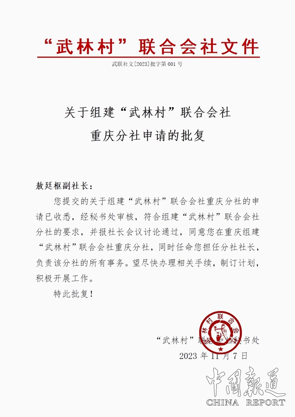 中国报道讯(吴蜀丰报道)11月7日,根据一指门创立人、武林村联合会社副社长敖廷枢的申请,经武联社秘书处审核,提交社长会议讨论通过,同意在重庆设立武联社重庆分社,并任命敖廷枢为重庆分社社长,全权负责分社建立及工作开展。