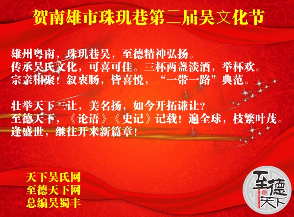 雄州粤南 珠玑巷吴,至德精神弘扬。传承吴氏文化,可喜可佳。三杯两盏淡酒,举杯欢。宗亲相聚!叙衷肠,皆喜悦,“一带一路”典范。壮举天下三让,美名扬,如今开拓谦让?至德天下,《论语》《史记》记载!遍全球,枝繁叶茂。逢盛世,继往开来新篇章!