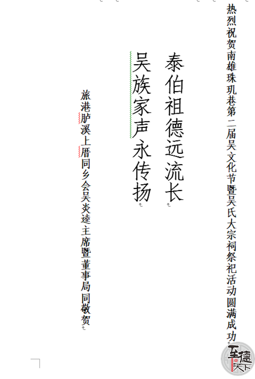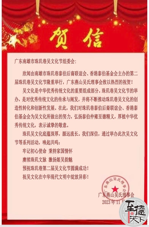 祝南雄市珠玑巷泰伯后裔联谊会、香港泰伯基金会繁荣昌盛! 祝愿南雄珠玑巷第二届吴文化节庆典活动圆满成功!