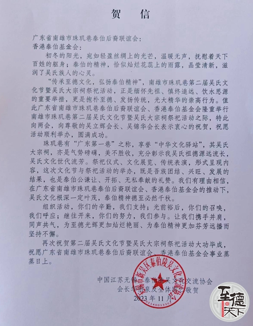 值此深秋之际,我代表无锡市吴文化研究会在遥远的无锡祖地,向您们表达我们诚挚的祝福和敬意。我们欣闻⼴东省南 雄市珠玑巷百姓堂由南雄市珠玑巷泰伯后裔联谊会、⾹港泰伯基⾦会联合举办南雄市珠玑巷第⼆届吴⽒⽂化节暨吴⽒⼤宗祠祭祀活动即将拉开帷幕,此刻的喜悦与激动,难以用言语来形容。