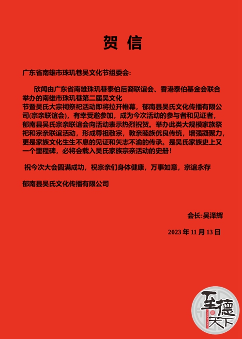 欣悉贵会在2023年12月2日, 举行广东南雄珠玑巷第二届吴文化节暨吴氏大宗祠祭祀活动!谨向你们致以热烈的祝贺!贵会此次活动能为宗亲谋福祉的发展做出了重大贡献,赢得了广大宗亲的认可!