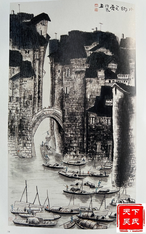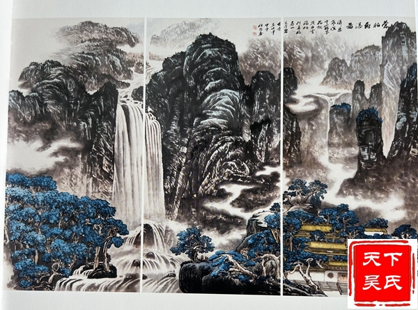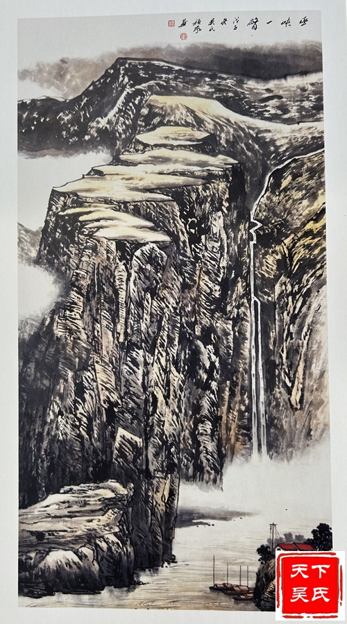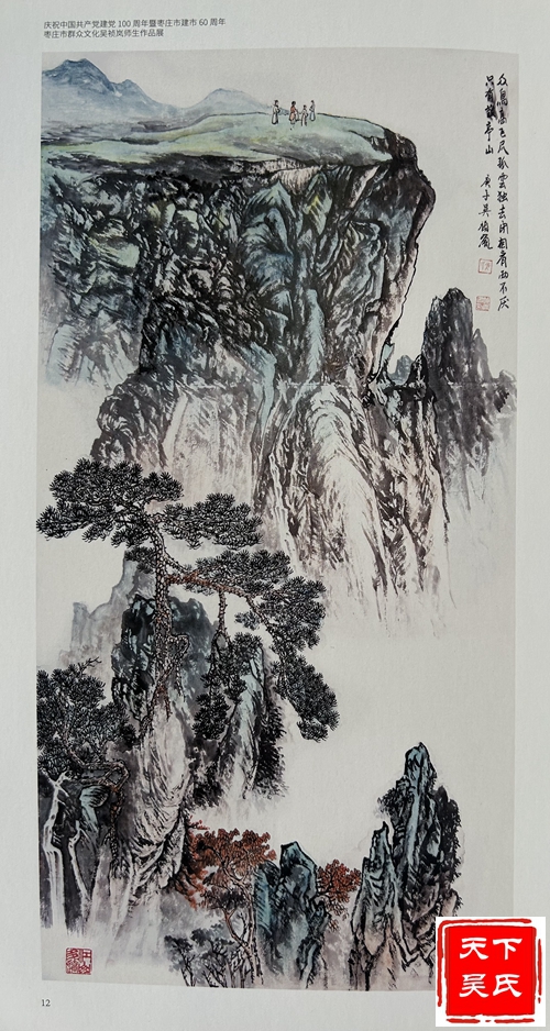吴祯岚功底深厚,“师古而不泥古,具有清越、华滋、温馨、磅礴的时代气息。”在他的笔下山水松柏、草木幽谷、小桥流水,风趣别致,令人回味无穷。连绵不断的山峦云雾笼罩时起时伏;那耸峙的峰峦、险峻的崖壁简直就是一把锋利的宝剑,直插蓝天里;千峰万嶂、重重叠叠,耸入云端,宛如万幅壮锦,仿佛天外来客;那高矮参差,前拥后簇的山峰时笑时眠。水时而潺潺细流,时而飞流直下,时而汹涌澎湃,掀起万丈海浪;近处树木苍阔葱茏,荡气回肠;远处迭峰错落,气势磅礴;那深邃迷离的幽谷,给人空朦冷峻之感;小桥流水人家,气韵充盈、飘逸洒脱,让人享受在欢快愉悦之中。