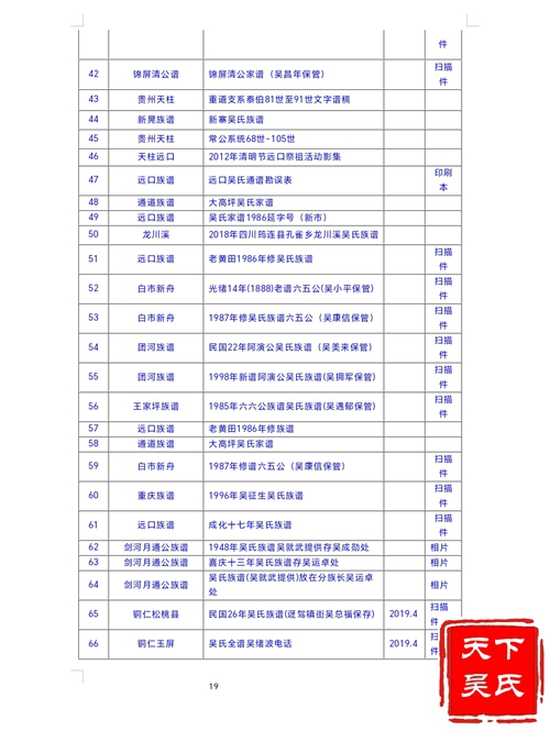 远口吴氏谱牒《远口吴氏通谱》 本书是中华人民共和国成立后,由贵州远口吴氏通谱编纂委员会,于2000年12月编印出版的第一部远口吴氏族谱。《远口吴氏通谱》总顾问吴恒章,编委主任吴定发,主编吴展明,副主编吴家治、吴恒传、吴远钧。本谱采用章节体,由序言、凡例、概述、世系、人物、文化、捐资、附录、后记、图照等部类组成。横排版,16开精装本,7分册约900万字。以世系和人物为主体,记述了远口吴氏从盛公至2000年共700多年的发展历史。