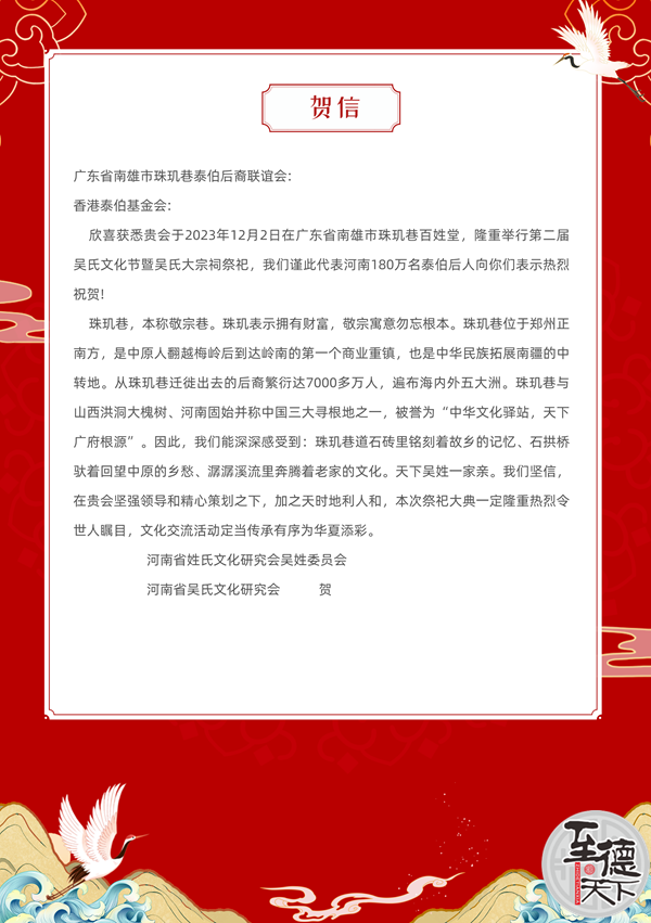 河南省吴氏文化研究会致南雄第二届吴氏文化节贺信