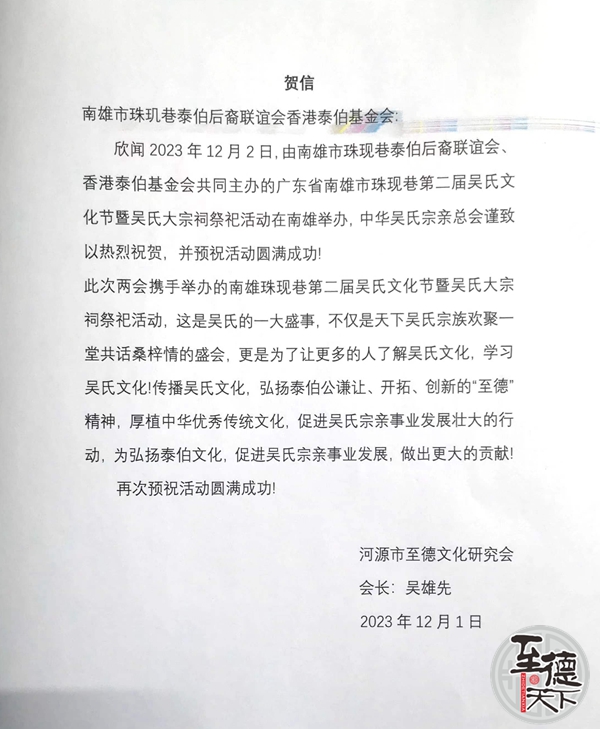 河源市至徳文化研究会致南雄第二届吴文化节贺信