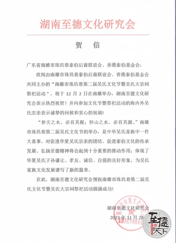 湖南至德文化研究会致南雄第二届吴文化节贺信