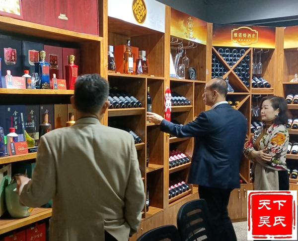 在秘书长吴君君陪同下,吴文富、吴昌禄前往海吴总商会常务副会长单位“永利汇生活馆”参观了内茶器茶具琳琅满目,品类齐全的生活馆后前往海吴总商会常务副会长吴汉成的“福建芳荣贸易有限公司”。芳荣贸易公司展示的酱香金沙古酒系列及酒库里储存的澳洲原装原瓶进口维诺特葡萄酒等多个品种。