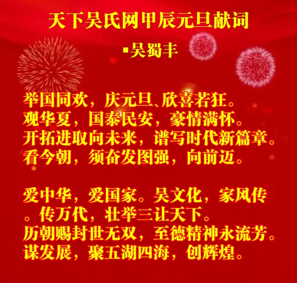 爱中华,爱国家。吴文化,家风传。传万代,壮举三让天下。历朝赐封世无双,至德精神永流芳。谋发展,聚五湖四海,创辉煌。
