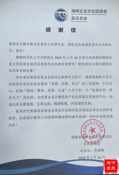 无锡市新吴区泰伯文化研究会致海吴总会贺电