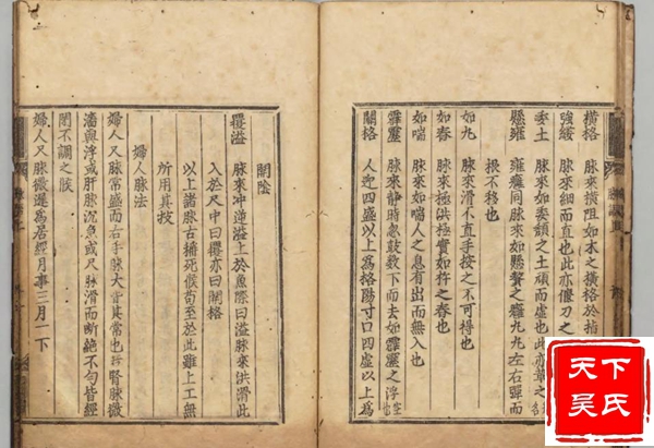 此外,有关“怪脉”,吴氏亦论列二十四种,较《脉经》大有增加。吴氏《脉语》除论述各种脉证外,还论述了太素脉。这可能是与明代太素脉盛行有关。吴氏反对太素脉邪说,对太素脉邪说深恶痛绝,但他又认为太素脉论中有可采之句,诸如他说:“太素之说,固为不经,然其间亦有可采者,如曰脉形圆净,至数分明谓之清;脉形散涩,至数模糊谓之蚀。质清脉清富贵而多喜,质浊脉浊贫贱而多忧……此皆太素可采之句也……”(《脉语•太素脉》可采之句)。这些道理实际是毫无可取的,因为在客观上还是肯定了太素脉的某些成份。但是我们如果考虑到明代社会的侈靡,太素脉盛行有其社会基础。那么吴氏在深刻揭露太素脉系“巫家之教”的同时,又表达了他对太素脉书中的一些论点的欣赏,亦不为怪。忖度吴氏脉学主流,仍然不失博湛精深的。