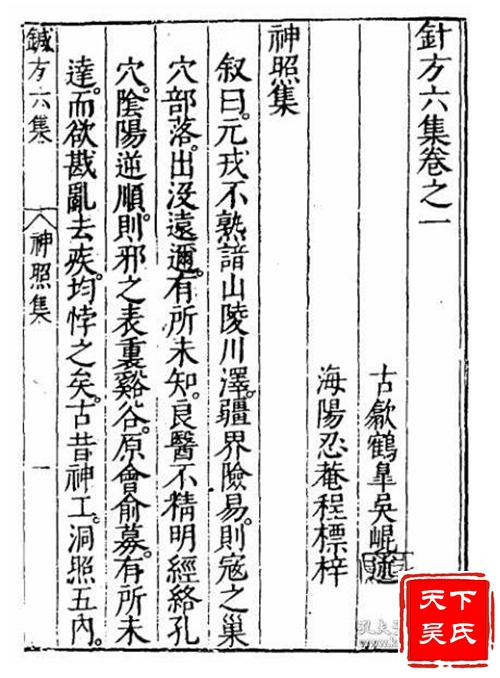67岁时,随着临证经脸的积累,学识日丰,对以往针砭治验不能尽得其中之奥旨者,经过三十年不断探讨,始破迷津,医学思想进入成熟期。带生徒23人(包括侄孙吴象先),将自己在针灸方面的研究心得,结合历代经典论述、医家歌赋,写成《针方六集》六卷,旨在羽翼《图经》(明刊《钥人腧穴针灸图经》)的学习使用。吴氏订校滑寿《明堂图四幅》(又作《正伏侧人脏腑明堂图》)。一并收人此书卷首“神照集”中,形成该书图文并茂的著述特点。