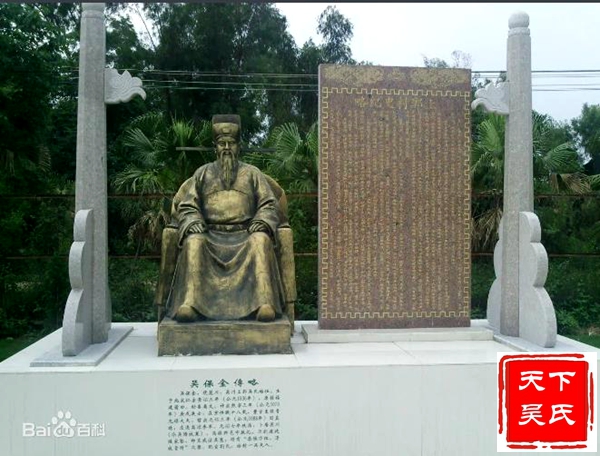 吴保金,号丽川,原籍福建莆田县珠玑南巷钱坡大井头,生于北宋仁宗景祐三年(1036年),神宗熙宁庚戌科进士(1070年),在京受职十八载,官至知枢密院事,授银青光禄大夫,哲宗元祐三年(1088年)谪高凉参军,宦满元祐七年(1092年)卜居宁川所,后因此地扩建吴川县城,让地迁上郭世居,遂为始祖,距今九百一十四年。配刘氏敕封一品夫人,卒葬高州府城内。
