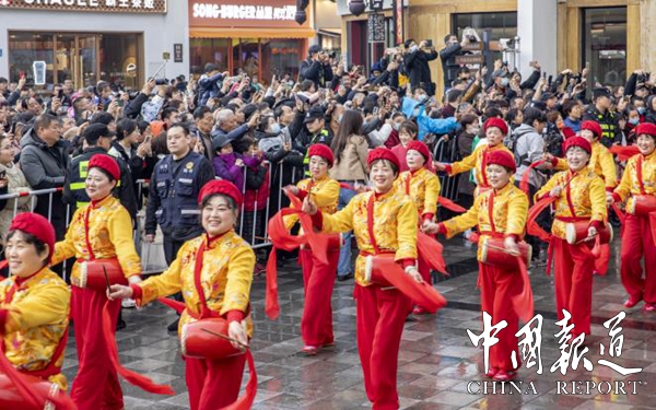 活动现场锣鼓喧天、热闹非凡。作为泰伯庙会的一大看点,极富地域特色的民俗巡游由来自梅村街道各社区的22支特色民俗队伍约400人组成,旗幡牌匾、舞龙舞狮、腰鼓、挑花篮、五福临门、汉服秀、旗袍秀等各类非遗、民间绝活流动表演,生动展示了绚丽多彩的江南民俗风情和梅里人民崇文善艺的精神面貌。