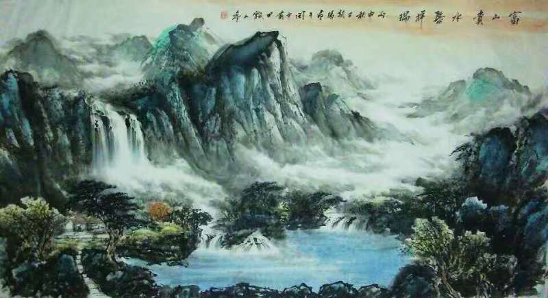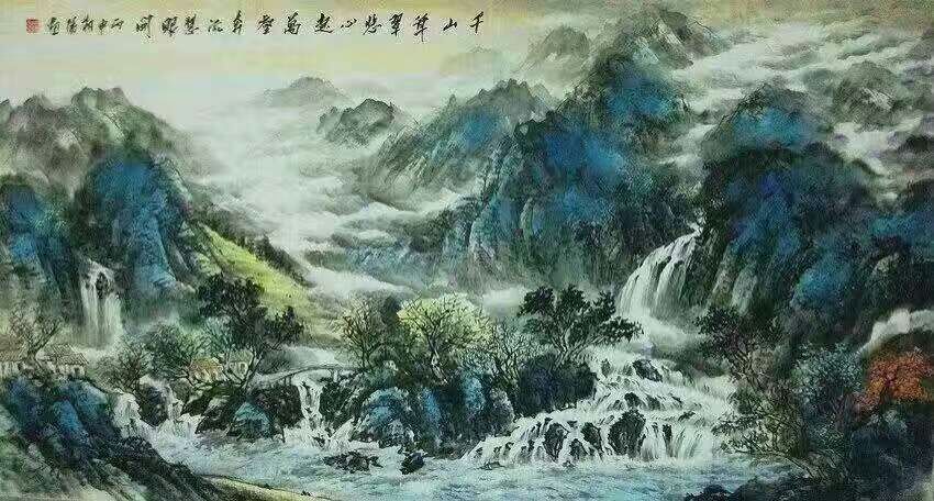 彩墨风水画《千山耸翠悲心起.万壑奔流慧眼开》尺寸;大六尺!