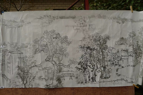 《千年古村宣庄》长12米,宽1米,为8张宣纸拼成,画面内容从最东面的宣庄新村,一直到新石桥、老石桥的西面。浓淡不一的墨痕中,有长漕河等水道,有水龙宫、吴氏宗祠等公共建筑,有商业老街,宣庄近160户人家都能在图中找到。
