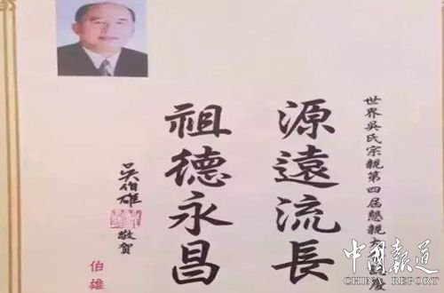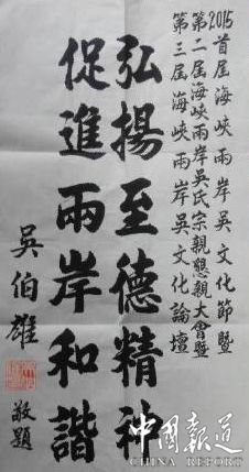 中国报道(记者吴蜀丰特约撰稿吴国庆)2015首届海峡两岸吴文化节暨第二海峡海峡两岸吴氏宗亲恳亲大会暨第三届海峡两岸吴文化论坛即将于12月16日—18日在福州长乐市隆重举行,福建省吴氏委员会(福建省吴氏宗亲总会)收到中国国民党荣誉主席吴伯雄“弘扬至德精神,促进两岸和谐”的题词和赠送的《台湾吴氏族谱》。