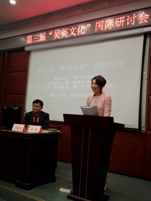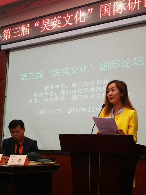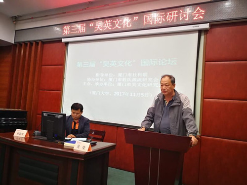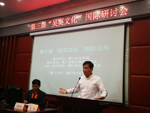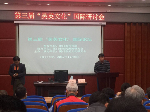 2017年11月5日下午,第三届“吴英文化”国际论坛在厦门大学南光101学术报告厅举行。本次活动是由厦门市社科联为指导单位、厦门市吴文化研究会为主办单位、厦门市姓氏源流研究会协办的一场关于“两岸吴英历史文献、田野实证及文化建设”的研讨会。