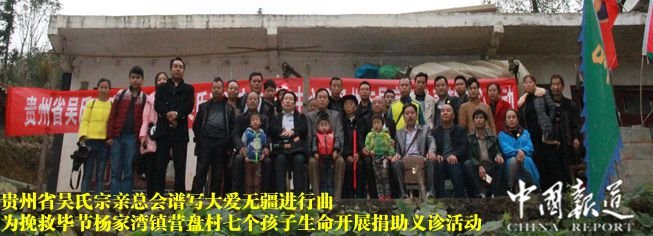 中国报道讯(记者吴蜀丰 吴立新特约撰稿 吴兴春 吴忠言 吴忠致 吴启林)2016年11月8日上午,中国报道网因受贵州省吴氏宗亲总会会长、贵州吴氏宗亲文化研究中心总会长吴学强邀请并随同贵州省各州市县15个吴氏宗亲会组织代表前往探望毕节杨家湾镇营盘村吴氏宗亲家的七个孩子,并现场开展捐资义诊献爱心活动。