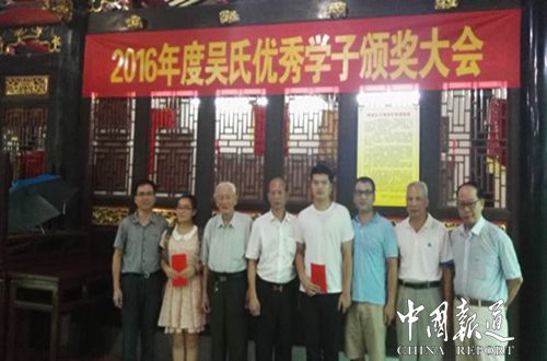 中国报道讯(记者吴蜀丰特约撰稿黄建平今日,(2016年8月13日)在福建省名物保护单位泉州吴氏大宗祠管委会举行2016年泉州吴氏优秀学子颁奖仪式,出席颁奖仪式有中华吴氏宗亲总会主席、泉州吴氏大宗祠管委会会长吴文富博士,中华吴氏宗亲总会副主席、泉州吴氏大宗祠管委会理事长吴孝岩,中华吴氏宗亲总会副主席、泉州吴氏大宗祠管委会常务会长兼秘书长吴瑞聘及泉州吴氏大宗祠副会长等。2016年泉州吴氏优秀学子来自石狮吴迪(清华大学)和安溪吴鸿斌(北京大学)各一万元的奖学金。据悉,中华吴氏宗亲总会每年都将对泉州吴氏优秀学子进行颁奖仪式。