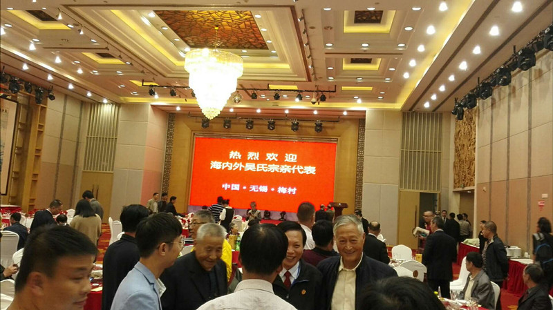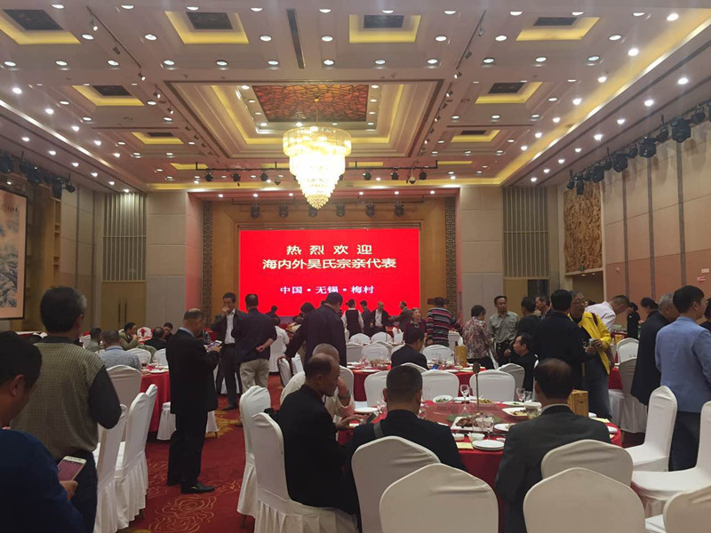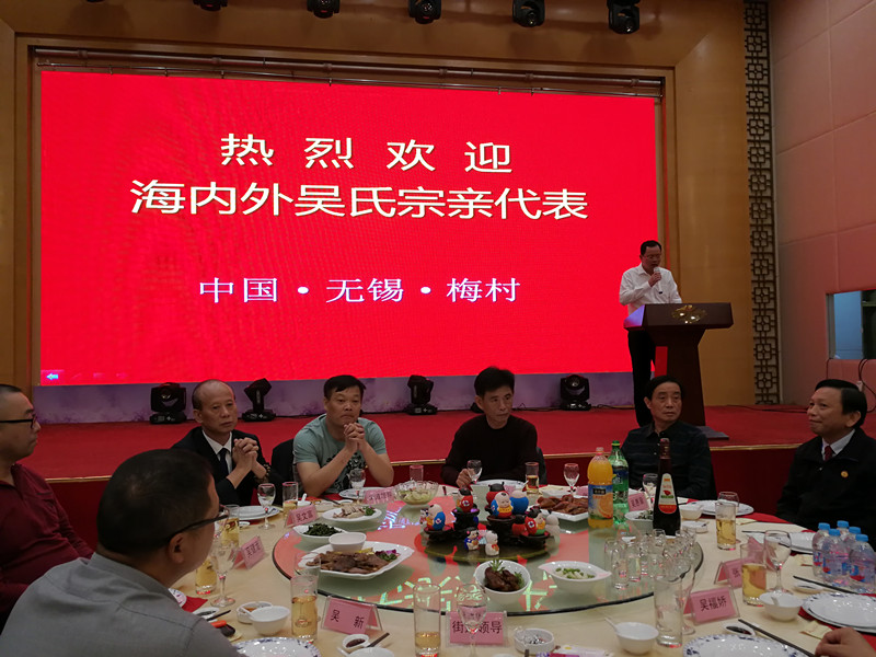 晚上七点组委会在无锡香梅国际大酒店举行盛大欢迎酒会!由《泰伯论坛》秘书长吴志云主持,首先新吴区梅村街道办事处尤伟主任发表欢迎词,接着泰伯吴氏祖地宗亲联谊总会吴立兴会长致祝酒词!整个酒会在热烈、温馨、和谐的氛围中进行。