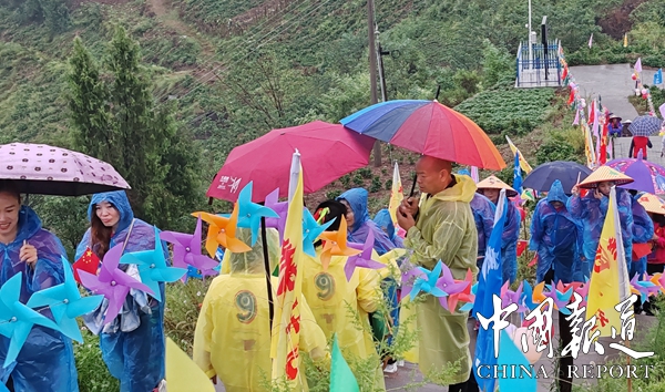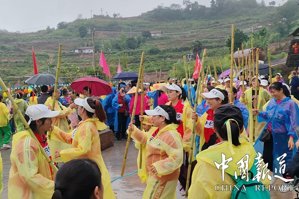 上午九点三十分,来自丰都县鬼城魅姊舞鼓舞队、丰都鬼城魅姊舞健身操团队、鬼城影子曳步舞、水花似朵曳舞团、丰都晴天曳舞健身团、名山广场舞健身队及周边附近村民近千余人在云上花顶台观景台共同庆贺农民丰收节。5家表演方队达218名表演者着黄色雨衣,在“你方唱罢,我登场”互动中,摆手舞、漫舞蹈、快节奏等丰富多彩的演出内容将现场氛围推向多次高潮,村民们也掏出手机各取镜头记录分享这难忘的精彩瞬间。