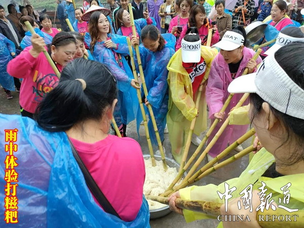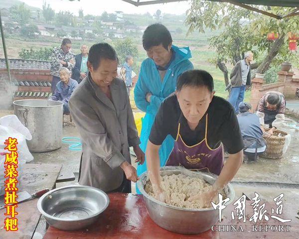 中午十二点三十分,表演方队来到荷花小院雨中体验打糍粑“抢糍粑”传统节日活动现场,在数百人中争先扭到一沱糍粑粘上黄豆粉白砂糖香喷喷的糍粑有滋有味,没有抢到糍粑的在怨言中却惊喜地迎来餐桌上的美味佳肴,老咸菜煮扯耳粑,特色豆花+碳烧海椒,凉拌茄子,凉拌海带丝,凉拌嫩南瓜尖,老南瓜绿豆汤等农家风味。平时吃惯了“大鱼大肉”的城里人在乡下品味久违的清一色素菜系列。找到童年时代的画面感。