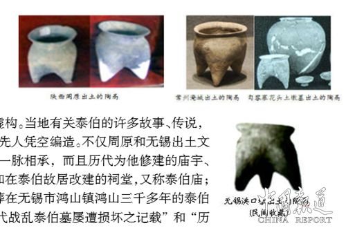 湾桥浜和冶坊浜间的伯渎河上有几排木桩深植河底,专家们推断这是一水 关(古时水关上有将士把守,外船进入城内需检查)。上述这块地周长与“周 三里二百步”正好吻合,此地应为泰伯城旧址。 此外,近来在无锡洪口墩遗址、常州淹城、江苏句容寨花头土墩墓、 江阴花山遗址、无锡县白丹山澄湖遗址也都相继出土一些先周人早期的生 活用品,如发明于陕西与甘肃交界的碾子坡一带,先周族人做饭用的炊具 ——陶鬲(在无锡锡山文管会也存有一件),外观跟笔者 2014 年在甘肃庆 城、宁县以及陕西周原博物馆看到的陶鬲几乎一样,说明周人到了这一带, 这说明吴文化跟周文化是一脉相承的。从现有史料和遗存看,两地文化交 融之桥的架 筑者恐怕非 泰伯、仲雍 莫属。 这些历 代史志所传 载的,并非虚构。当地有关泰伯的许多故事、传说, 也决不会是先人凭空编造。不仅周原和无锡出土文 物陶鬲如此一脉相承,而且历代为他修建的庙宇、 墓地尤存,如在泰伯故居改建的祠堂,又称泰伯庙; 泰伯死后,葬在无锡市鸿山镇鸿山三千多年的泰伯 古墓;“历代战乱泰伯墓屡遭损坏之记载”和“历 代帝王、政府敕令、决定修墓记实”等古迹和文物档案至今保存完好,这 都是很好的佐证。尽管泰伯所到的梅里到底在哪里?是无锡还是丹阳有争 论,但笔者认为,在没有足够史料否定之前还是认可这些既成的历史事实, 泰伯的确到江南,到梅里。 那么,泰伯为什么奔吴。司马迁在《史记》卷册一《吴太伯世家》中 已说得十分清楚,只是对泰伯怎样到江南和奔吴的路线并未提及,故后人 陸有朝东 、往南和走 路、水路猜测。笔者仅就这些问题,进行了如下探讨: (未完待续)