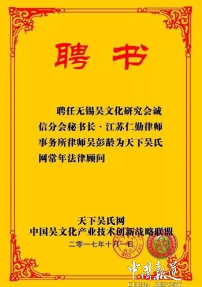 常年法律顾问吴彭龄 执业证号码:13202199210937510 江苏仁勤律师事务所