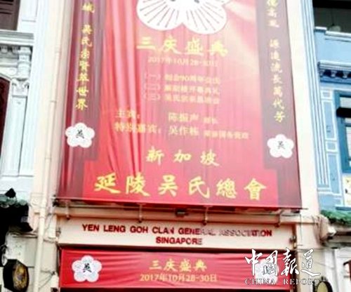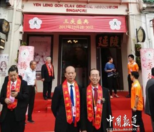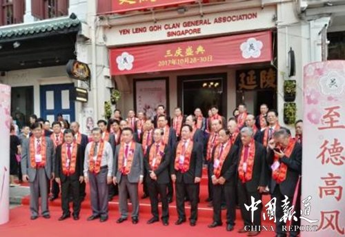 中国报道讯(记者吴蜀丰特约采编 吴谨程)辉煌九十载,品鉴岁月香。2017年10月29日,新加坡延陵吴氏总会“三庆盛典”在狮城隆重举行。中华吴氏总会主席吴文富博士率中华吴氏各地宗亲代表团参会。
